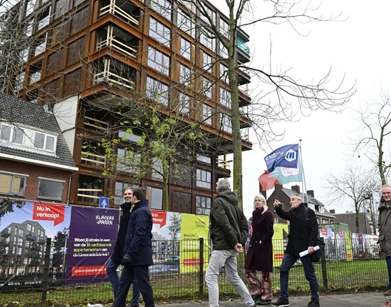 Foto: Minister Mona Keijzer en wethouder Eddie Förster (uiterst links), op de achtergrond gebouw de Blikvanger in aanbouw door Winters bouw & ontwikkeling voor woningcorporatie Alwel.