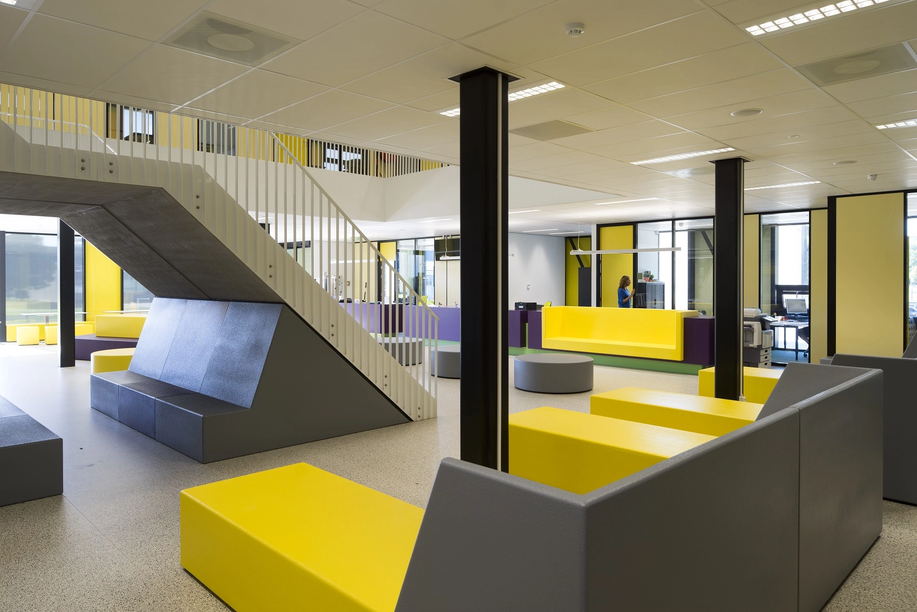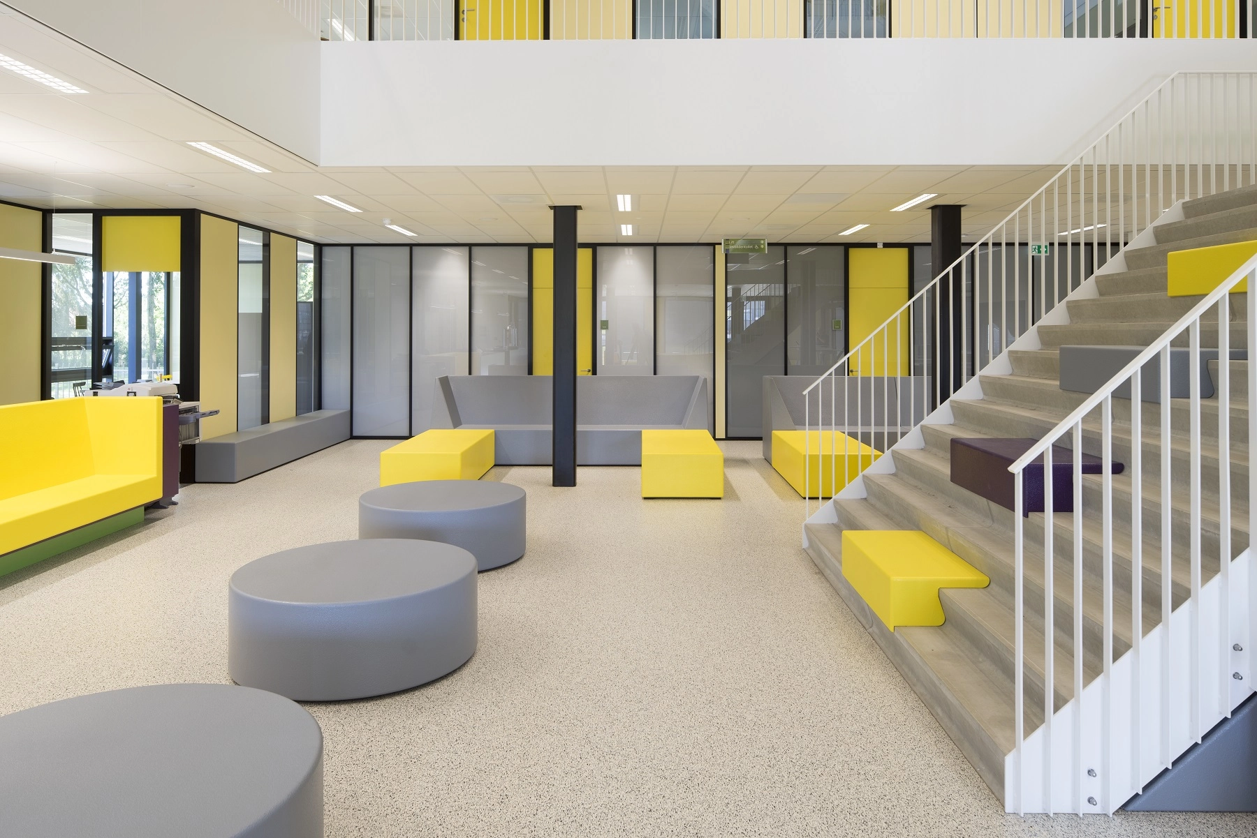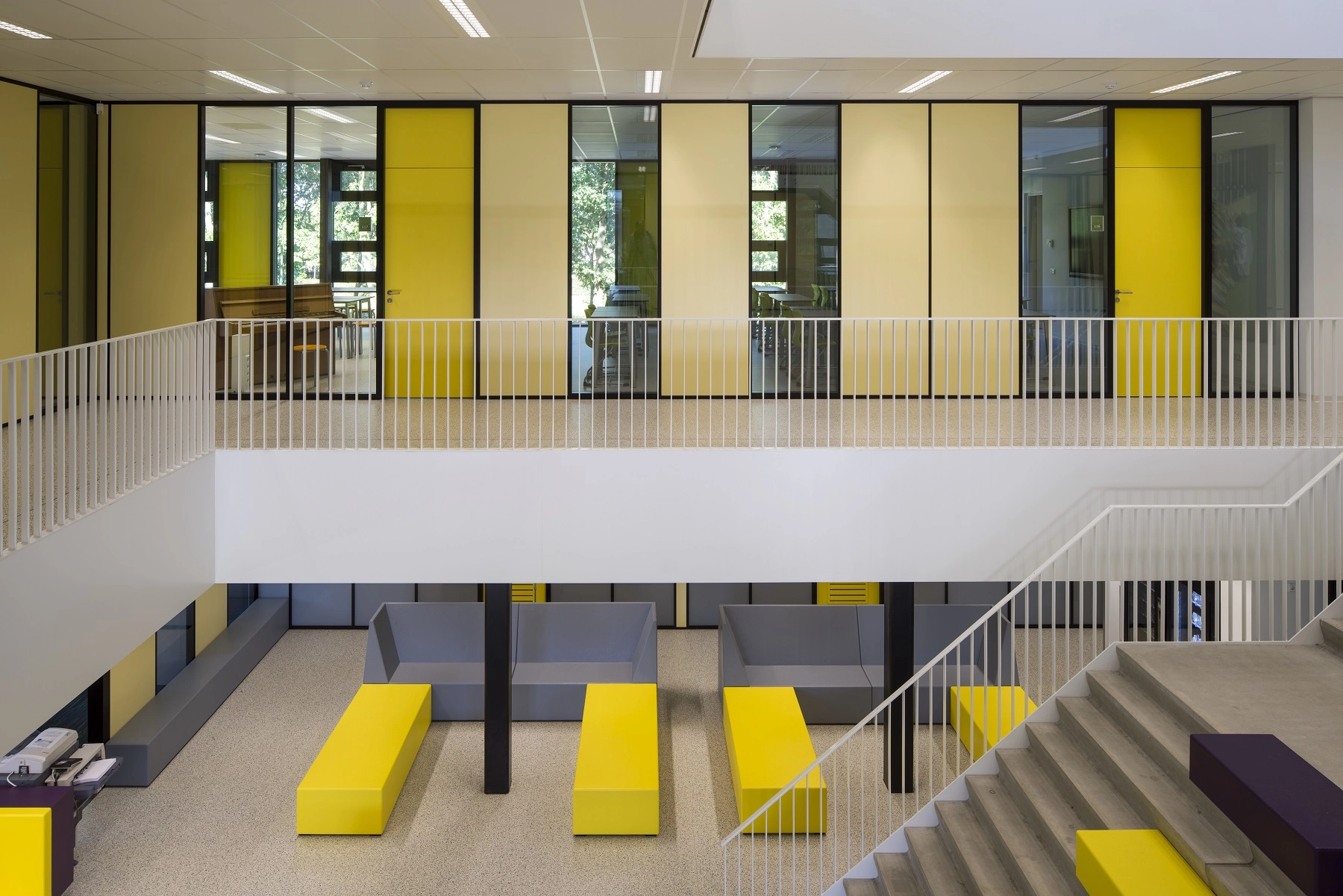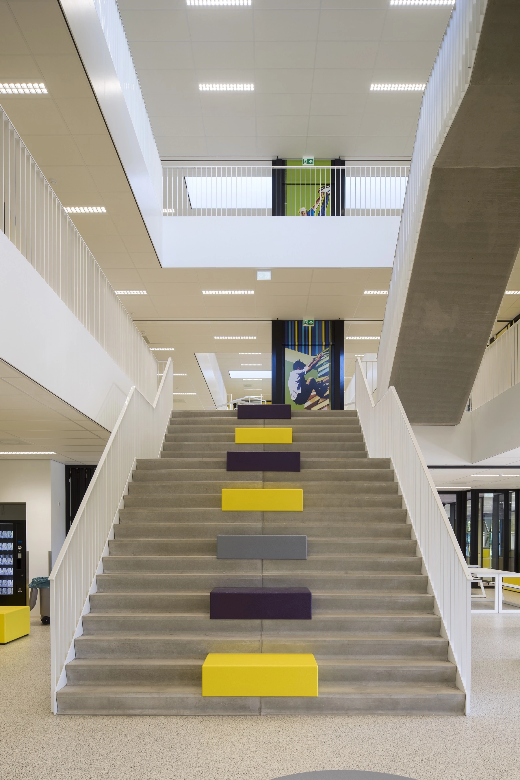 Het gebouw bestaat uit 4 bouwlagen. De gymzaal bevindt zich in de kelder waarin zich ook de kleed-en doucheruimtes en een technische ruimte en een grote berging bevinden. De gymzaal is aan een zijde voorzien van een aluminium vouwwand die in geopende stand, en met een uitschuifbare tribune, de naastgelegen multifunctionele ruimte en de aula/kantine op de begane grond bij de gymzaal trekt zodat de gymzaal multifunctioneel gebruikt kan worden gecombineerd met de 2 genoemde ruimtes. Op de begane grond bevinden zich de entrees, lockerruimtes, toiletgroepen en vergader- en docentenruimtes. De 1e verdieping en 2e verdieping zijn middels grote vides met betontrappen toegankelijk gemaakt. Deze vides zijn omsloten door werkpleinen. Op de verdiepingen bevinden zich 16 leslokalen. Deze zijn d.m.v. transparante puien afgesloten van de verkeersruimten en de werkpleinen.
