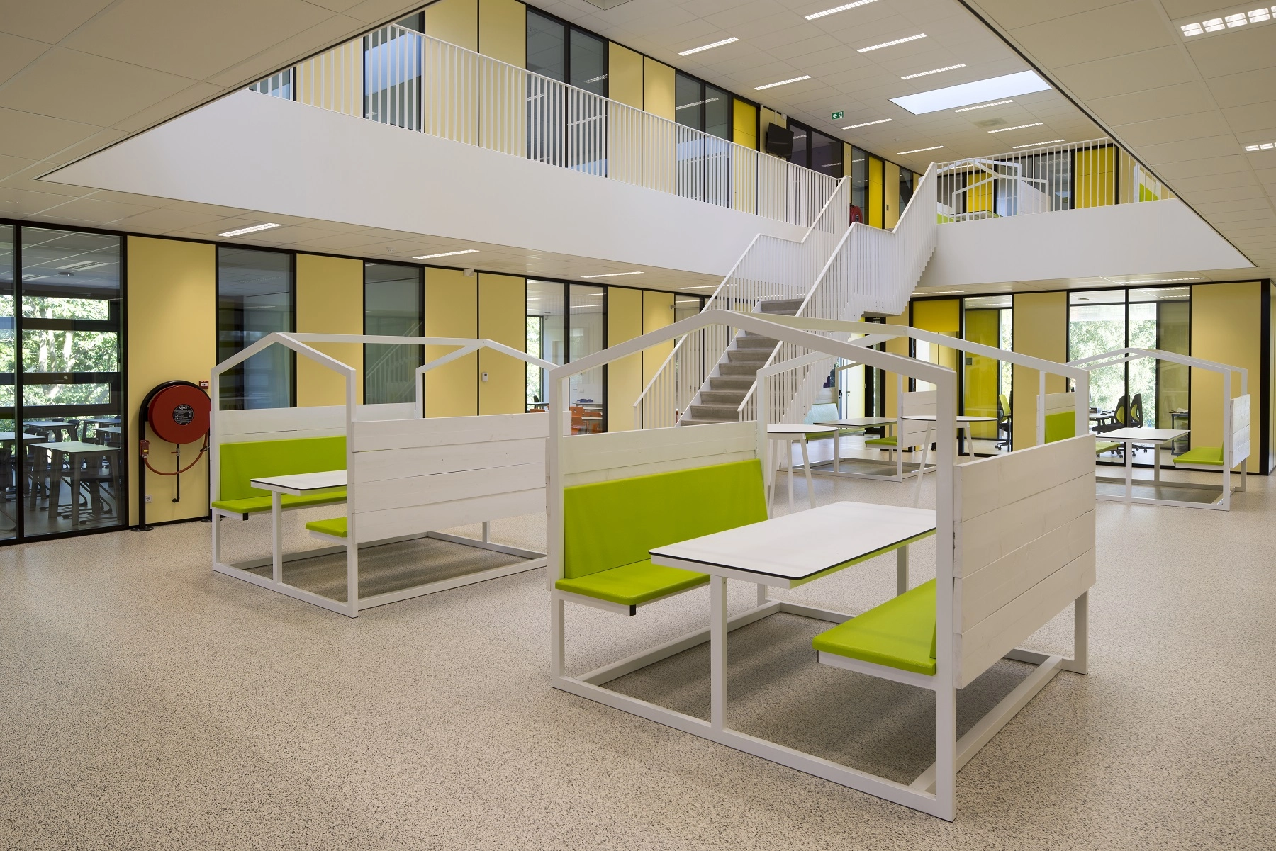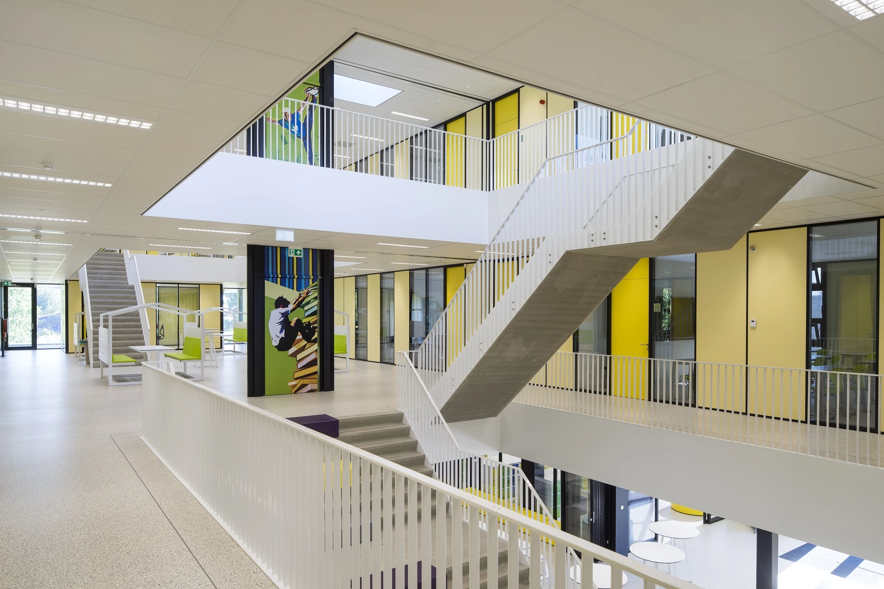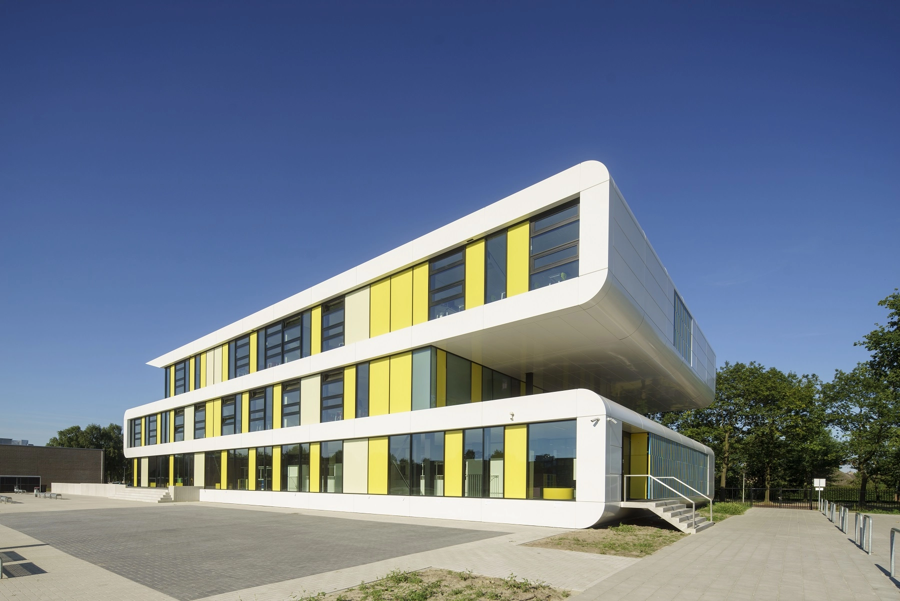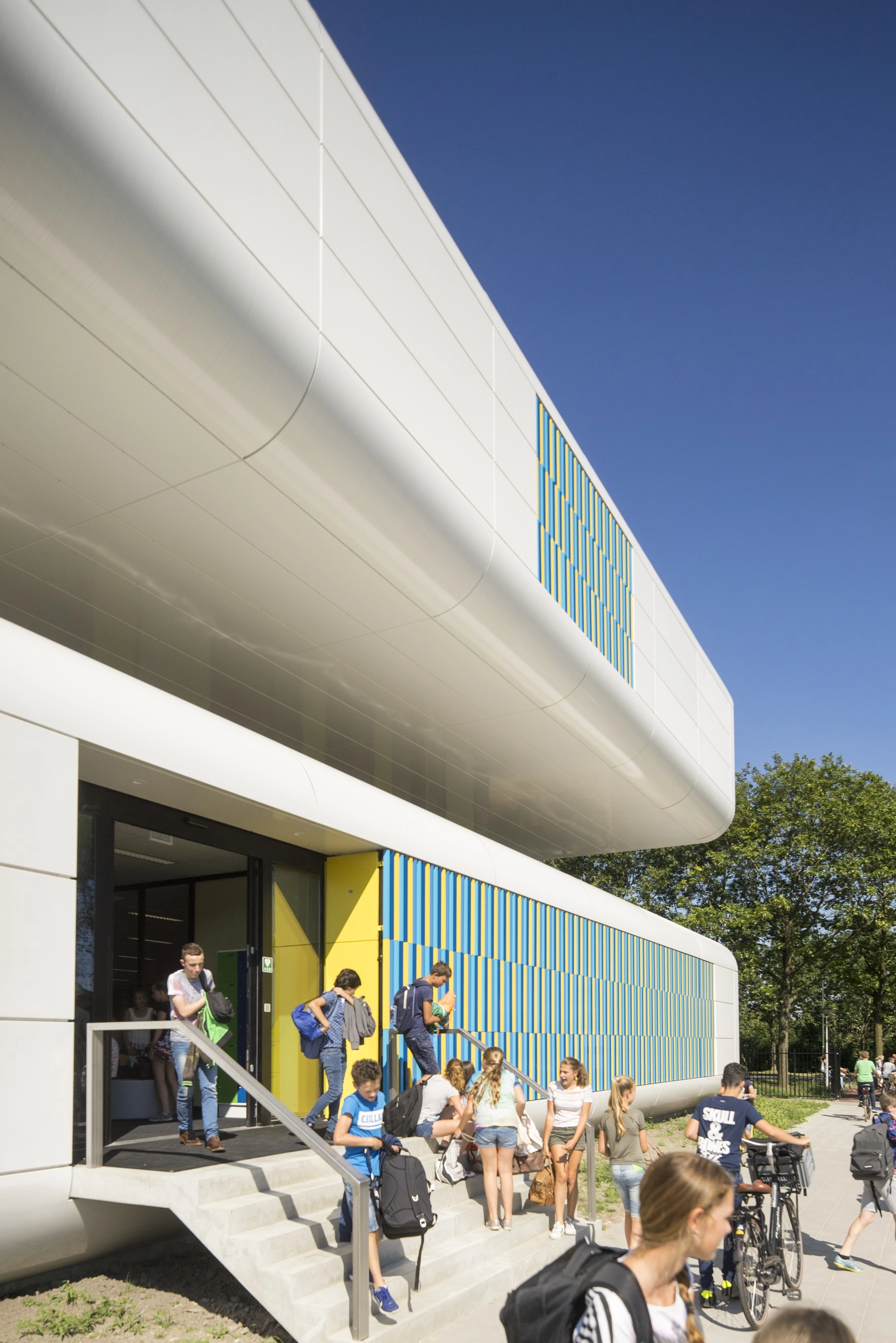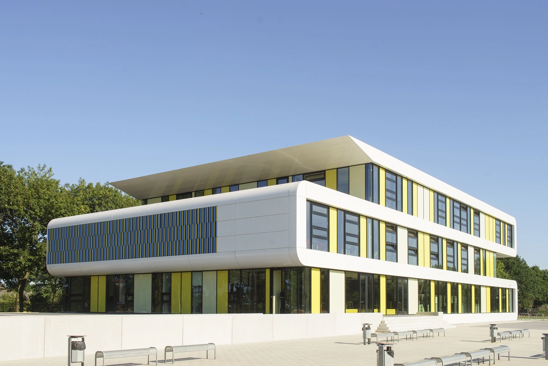 In het dak bevinden zich 3 lichtstraten. De combinatie van vliesgevels, vides, verdiepingshoge aluminium binnen puien en lichtstraten zorgt ervoor dat de school transparant uiterlijk heeft gekregen. Het schoolgebouw is in september 2016 in gebruik genomen.
